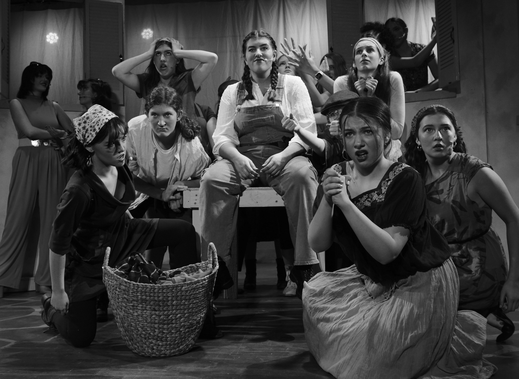 Our 2024 spring musical, MAMMA MIA!: the villagers and Donna lament about their "Money, Money, Money" problems (Charlotte Fairbanks, Pearl Page, Alex Dennis, Samantha Maragas, Kathryn Hansen, Jasper Merth, Mary Walston, Brenna Farnsworth, with Izzy Moon, Katey James, and Natalie Arnold).